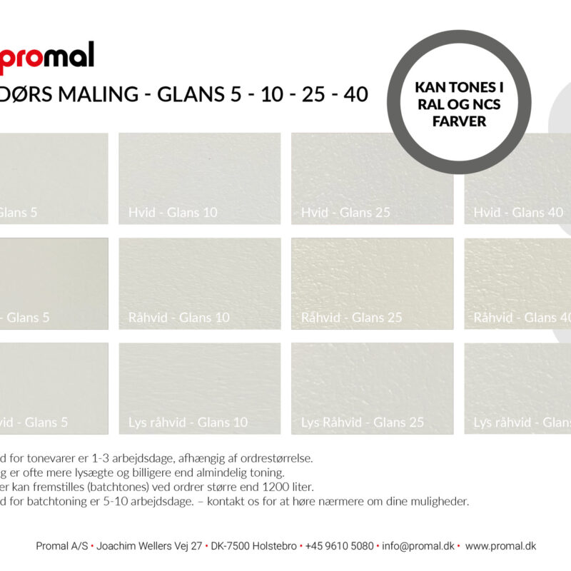 | Farve | Hvid, Lys råhvid; NCS 0500N, Råhvid; RAL 9010 |